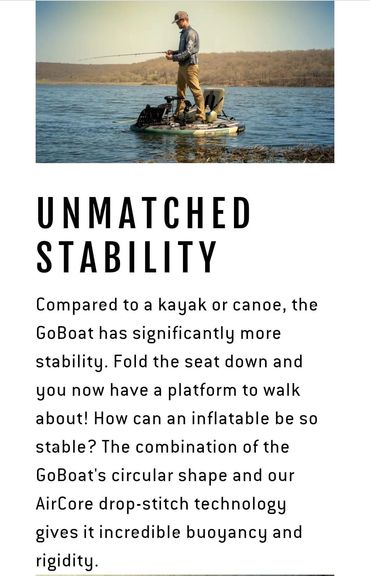 Introducing the most lightweight, battery powered boat, portable boat on the planet: GoBoat 2.0! This rugged PWC is virtually impenetrable and fits in a bag! Itmarket. No need to stand or paddle, just kick back with a cold one and cruise in comfort. It's perfect for exploring, fishing, or playing bumper boats with the family. With its ample storage bungees and room behind the seat for a cooler, you can hang all day on the water. Included are two t-slot rails for attachments, like a cup holder, fishing rod holder, fish finder, and more. With our 5-speed motor, you can cruise at 5 mph. The GoBoat's quick maneuverability and shallow depth allows you to reach places most boats can't go. When you're done, simply deflate it and toss it in the trunk, and it's small enough to n in a closet!